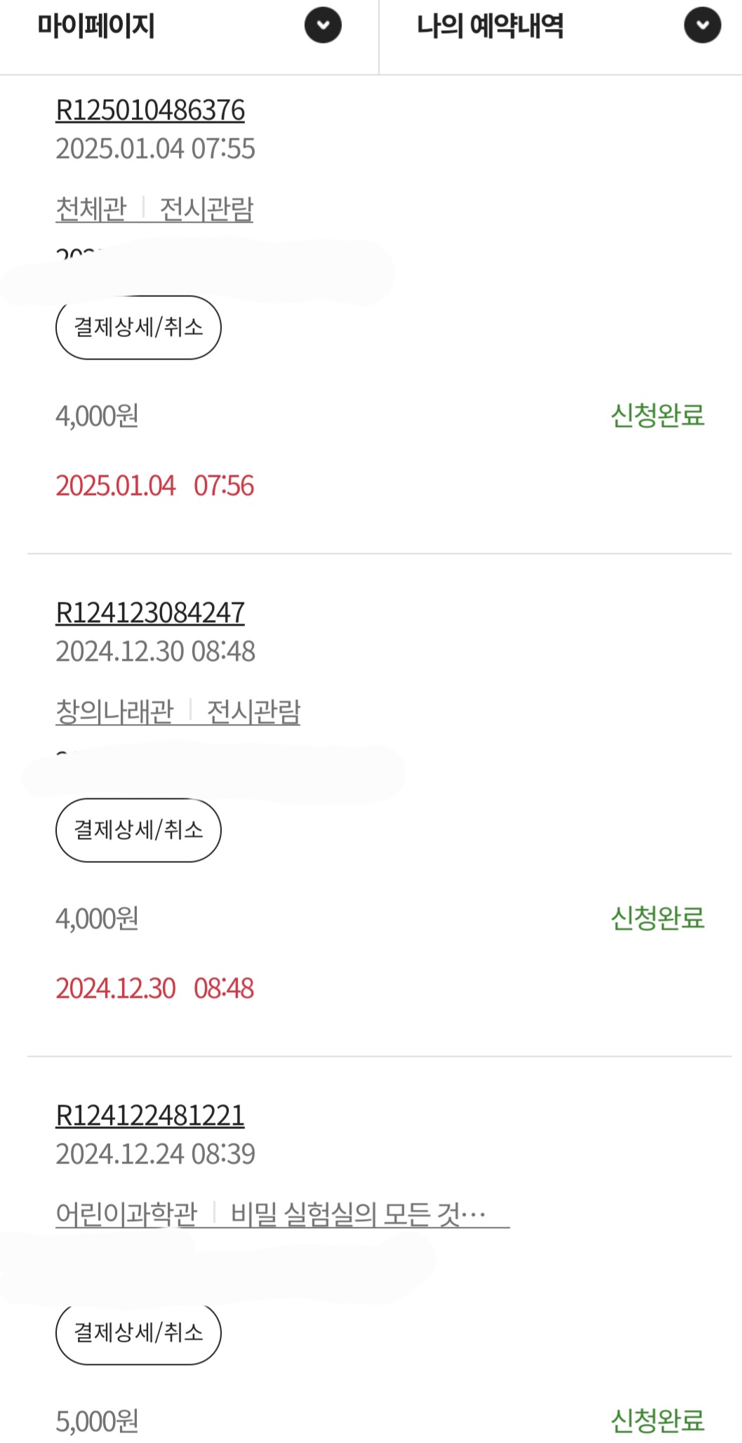 저의 예약내역이에요.